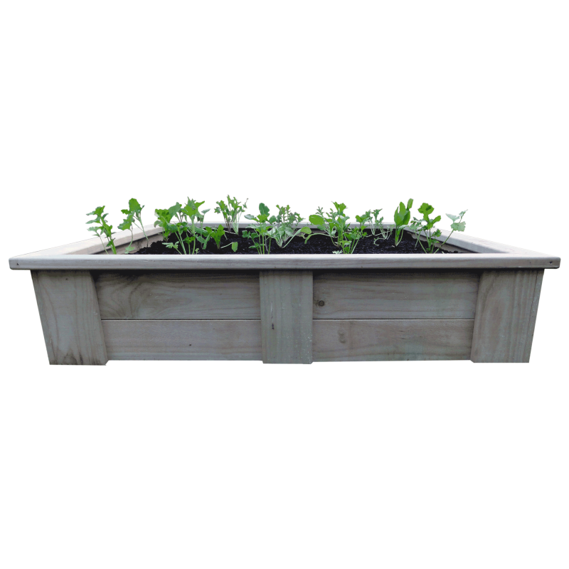 Constructed from New Zealand Pinus Radiata H3.2 Timber (sourced from a Renewable Resource), with rustic sides, and a smooth top. Just add soil and plant straight into the raised planters.